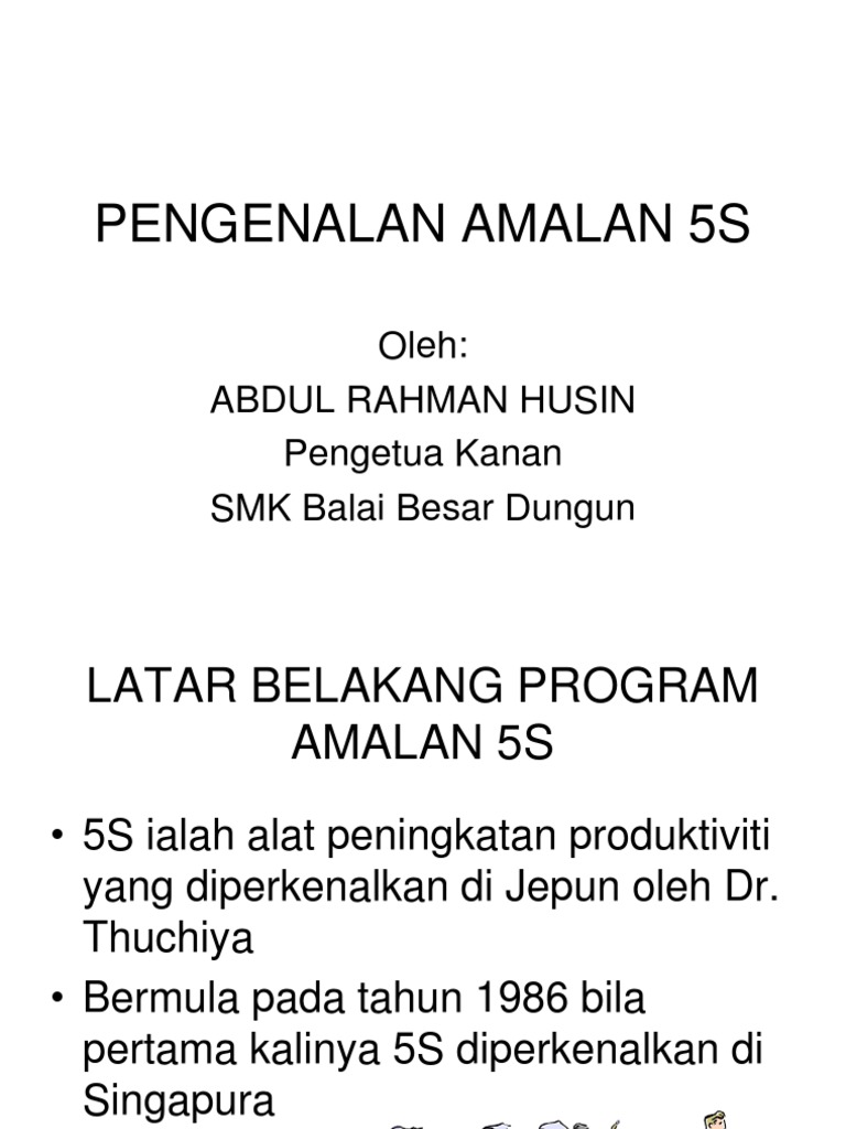 Amalan 5s Ebuletin Jabatan Teknologi Pendidikan from ebuletinjtp.files.wordpress.com Amalan 5s ialah kaedah atau alat pengurusan yang boleh mewujudkan persekitaran di tempat dalam bahasa jepun, 5s tersebut adalah seiri, seiton, seiso, seiketsu dan shitsuke dan bagi dalam bahasa melayu pula, ia memberi maksud sisih, susun, sapu, seragam dan sentiasa amal. Thuchiya • bermula pada tahun 1986 bila pertama kalinya 5s. Latar belakang program amalan 5s • 5s ialah alat peningkatan produktiviti yang diperkenalkan di jepun oleh dr. Amalan 5s merupakan satu kaedah pengurusan yang diperkenalkan bertujuan mewujudkan persekitaran kerja yang kondusif, selamat, selesa dan berkualiti. Amalan 5s merupakan alat pengurusan persekitaran berkualiti yang dipelopori oleh jepun dengan penumpuan kepada lima (5) langkah tindakan pelaksanaan yang bermula dengan huruf awalan ‛s ‟ yang bermatlamatkan pengurusan amalan kebersihan yang bersistematik. Jpn kuching bermula pada tahun 2006. Abdul rahman husin pengetua kanan smk balai besar dungun. Membina budaya kerja yang positif dan dinamik.