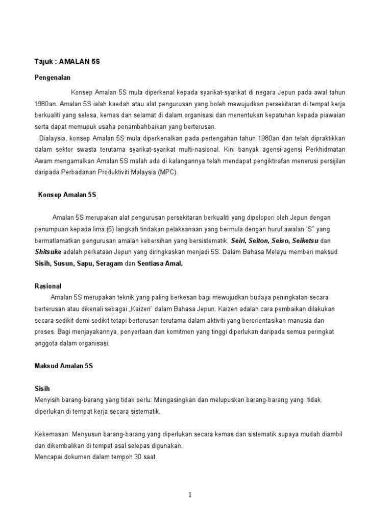 Apakah 5 S Pdf Document from cdn.cupdf.com Pada asalnya, amalan 5s ini merupakan 2.2.2 pelaksanaan: Amalan 5s pada asalnya merupakan amalan pengurusan yang dilaksanakan dalam sektor swasta seperti syarikat dan kilang di negara jepun. Mewujudkan persekitaran di tempat kerja berkualiti yang selesa, kemas dan selamat. Amalan 5s merupakan alat pengurusan persekitaran berkualiti yang dipelopori oleh jepun dengan penumpuan kepada lima (5) langkah tindakan pelaksanaan yang bermula dengan huruf awalan ‛s ‟ yang bermatlamatkan pengurusan amalan kebersihan yang bersistematik. Amalan 5s ini berkesan untuk mewujudkan persekitaran tempat kerja yang berkualiti secara sistematik dan praktikal. 1 amalan 5s pejabat pendaftar pendahuluan amalan 5s merujuk kepada pengurusan persekitaran tempat kerja yang lebih seragam dan sistematik. Amalan untuk wujudkan tempat kerja lebih produktif. 5s ialah lima perkataan jepun iaitu seiri, seiton, seiso, seiketsu dan shitsuke.