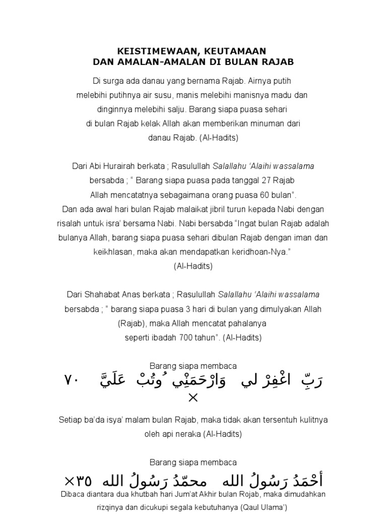 Amalan Jumat Terakhir Pada Bulan Rajab Qursyiban from qursyiban.com Bersama ramadan, sya'ban dan rabi'ul awal atau maulud, menjadi icon penting umat islam untuk mendekatkan diri pada sang ilahi. Sesungguhnya barang siapa pada akhir jumat bulan rajab, saat khatib berada diatas mimbar membaca: Di bulan rajab ini, kita dianjurkan untuk memperbanyak amal kebaikan dan ketaatan. Pertama, memperbanyak puasa sebagaimana disabdakan oleh baginda nabi muhammad shallallahu 'alaihi wasallam: Banyak habaib dan kiai mengijazahkan amalan ini. Salah satunya adalah amalan jumat terakhir di bulan rajab. Seluruhnya dalam ketetapan allah di hari dia menciptakan langit dan bumi. Sedikit tambahan dari bebrapa kitab yg saya baca ada amalan di bulan rajab diantanya 1.